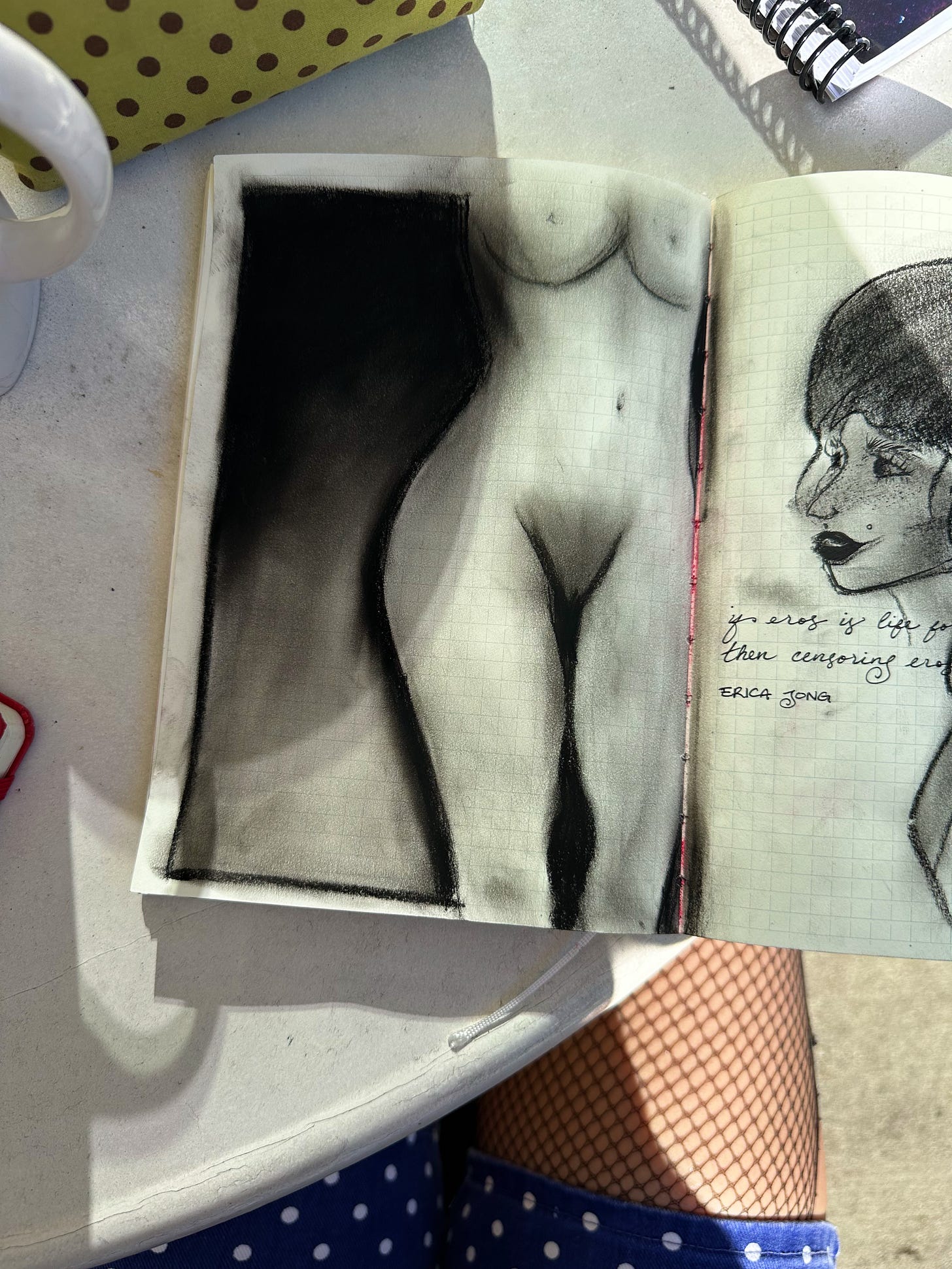 I got a graphed journal this week, which I’ve shunned all my life despite its utility because of how much it reminds me of math, but I broke down because I was influenced by Heaven Sent Honey’s4 art journal tour (hers was graphed, which helps make structured spreads). I found some ancient Prismacolor hard pastels in my bottom desk drawer, which I've been having fun with. I like working in high contrast, emphasizing light and shadow; most of the time I sketch in black gel pen. Getting my hands dirty with the velvety black charcoal-like medium feels primal and cathartic and allows me to work with light and shadow directly as well.