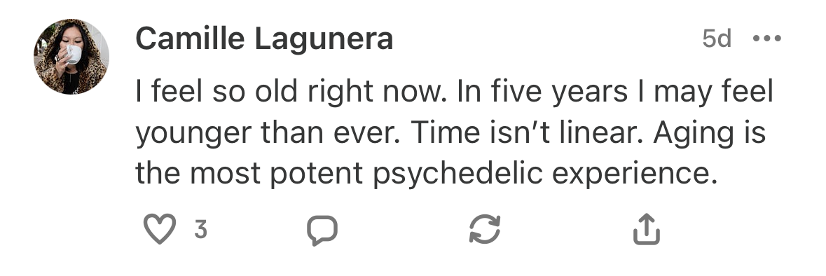 I told my mom of my youth dawning on me and she said, “Why would you think that? You can be impressionable at 28 or 35…” She stopped there. This scared me. I don’t ever want to stop absorbing and alchemizing. Maybe I’ll never feel old again if inspiration and creation continue forever.